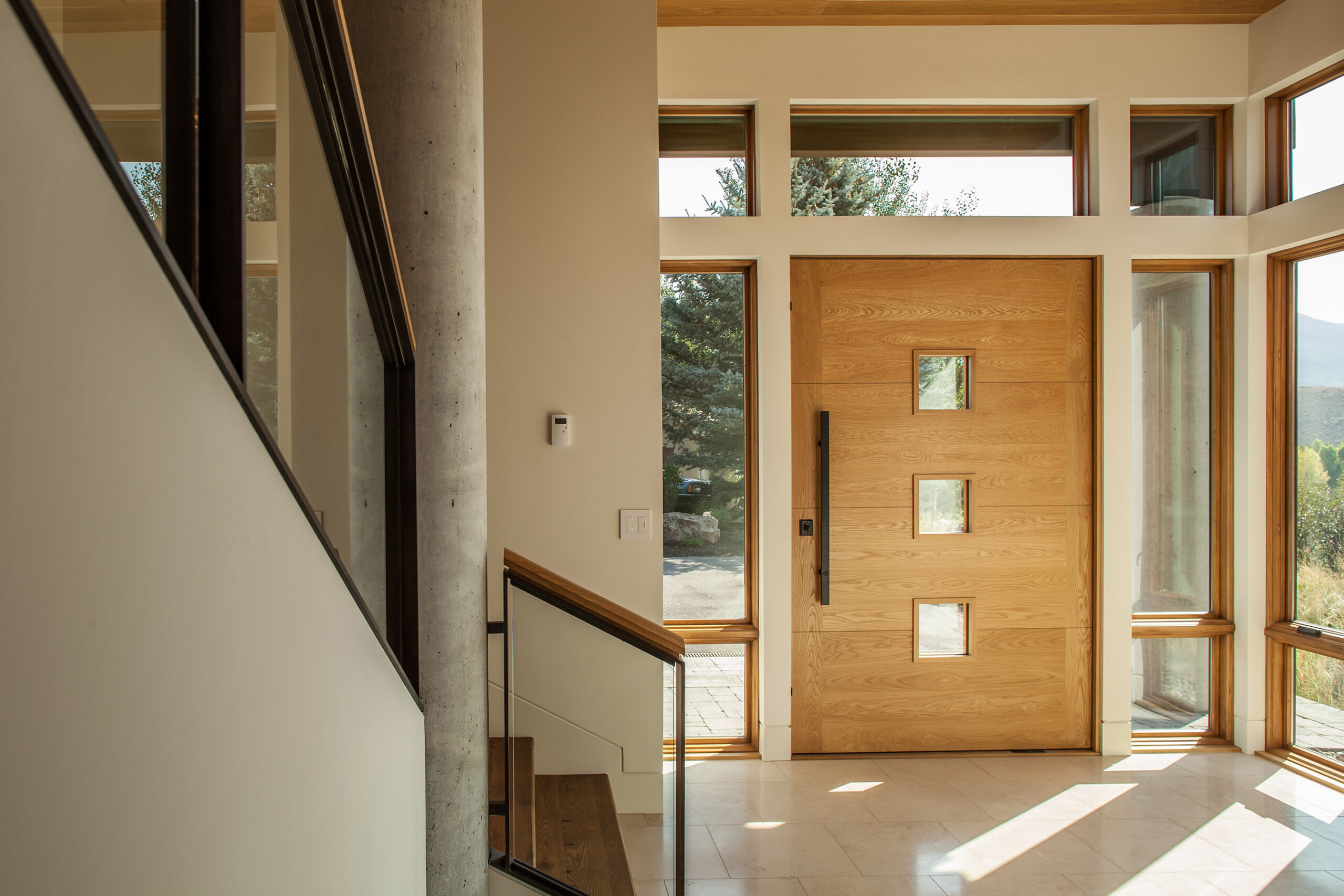 Located in the Elkhorn area of Sun Valley, this home is designated on a sloping hillside lot with many exposed rock outcroppings. The design of the home attempts to save the natural features of the lot and take advantage of distant views across the Elkhorn golf course and mountains beyond. An 8′ diameter boulder is the central natural feature to which the home responds, creating a courtyard, as the footprint of the home wraps around it. The primary living spaces occur on the upper level of the home with guest bedrooms below.